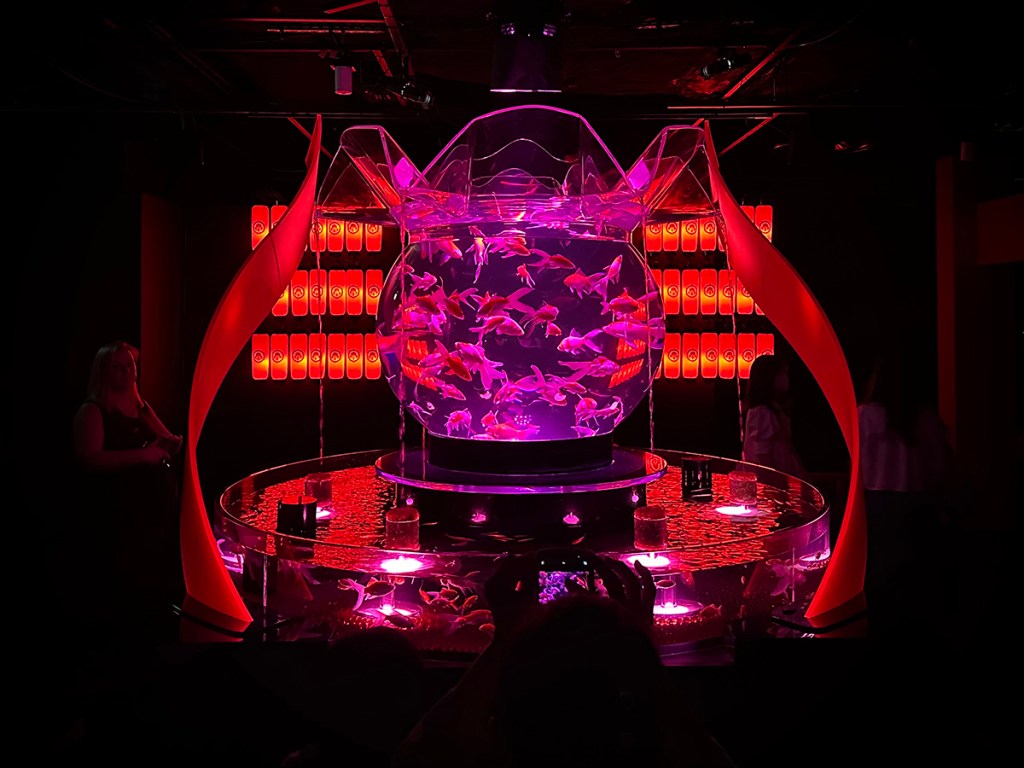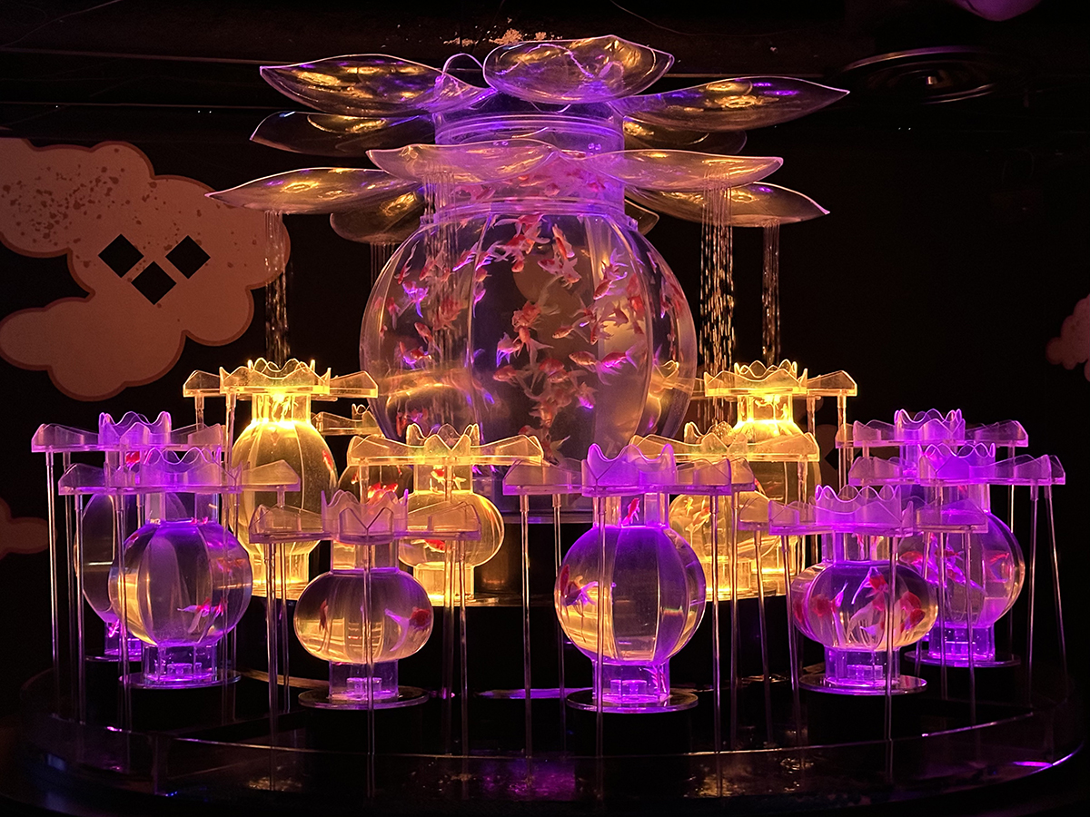 and these stone lanterns that really convey that if goldfish had a shrine, Art Aquarium would be it.