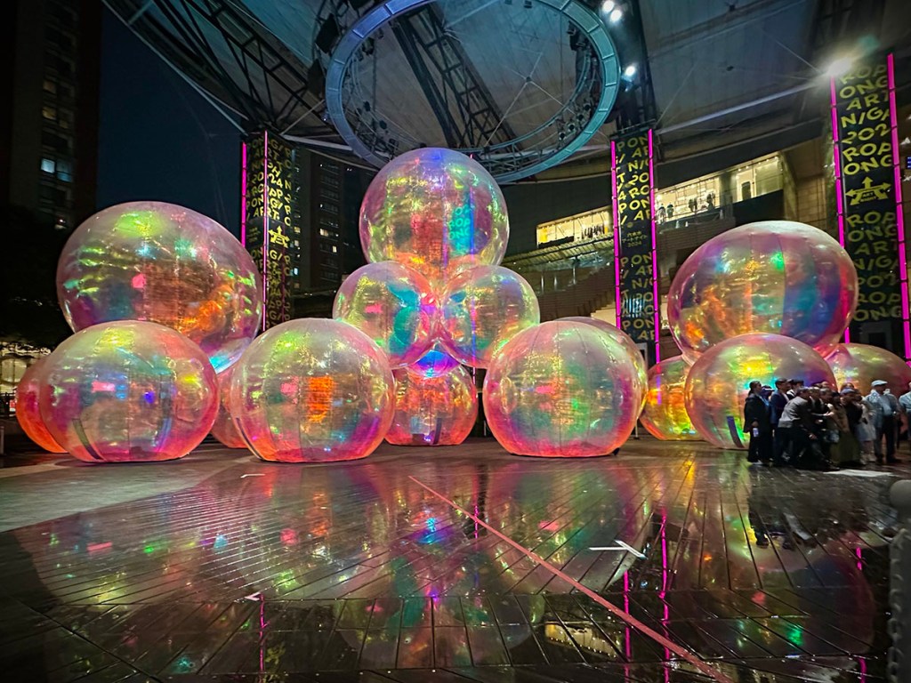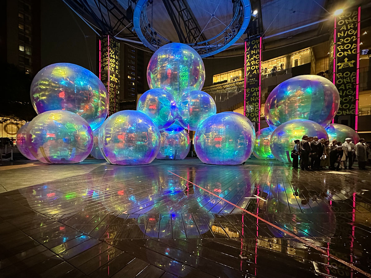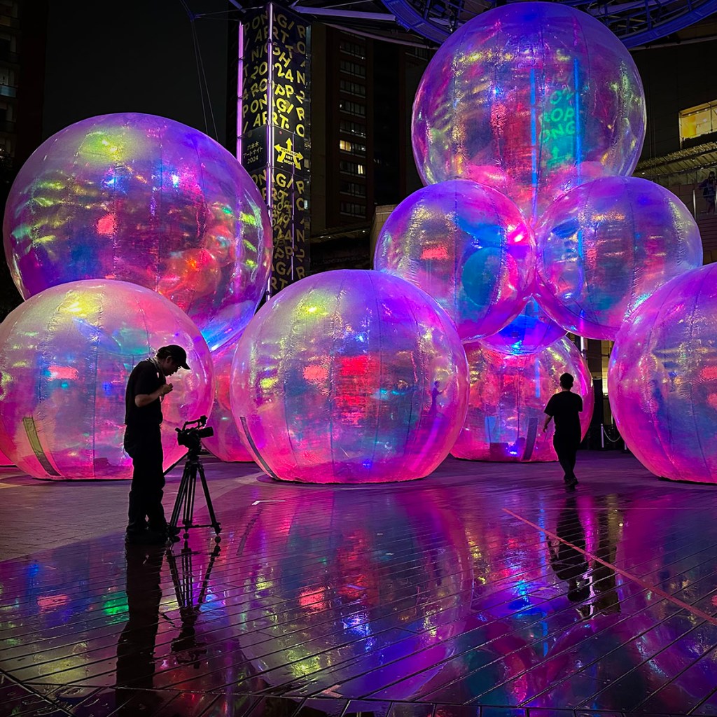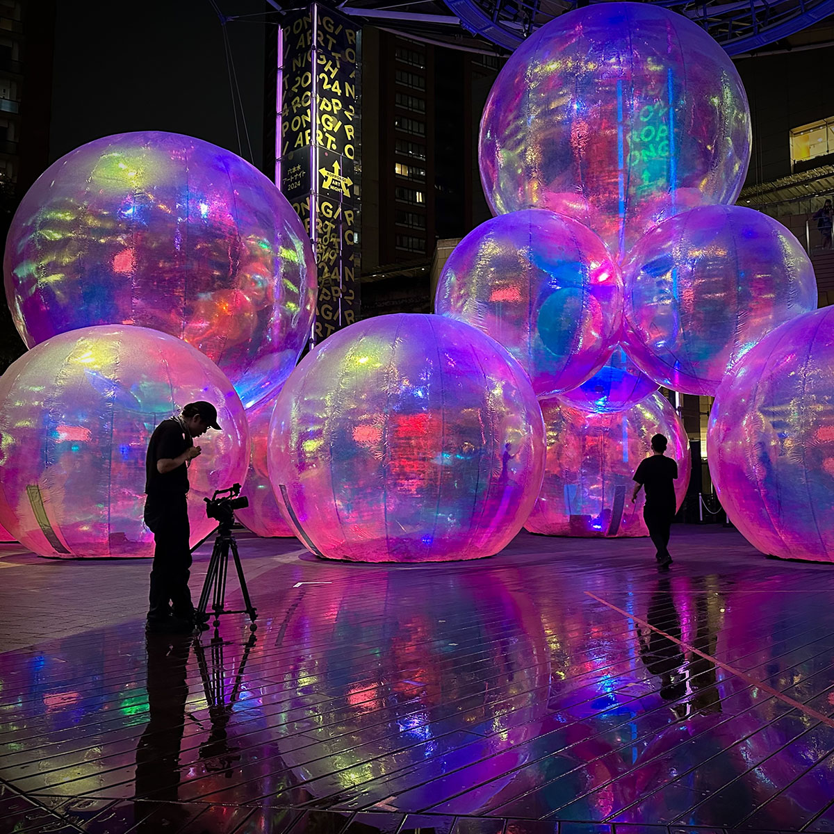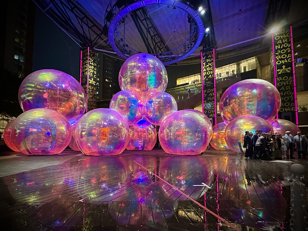 with an installation of giant iridescent spheres that changed color with the music and dance performances staged periodically throughout the evening. In between, photo ops were available for VIP guests…