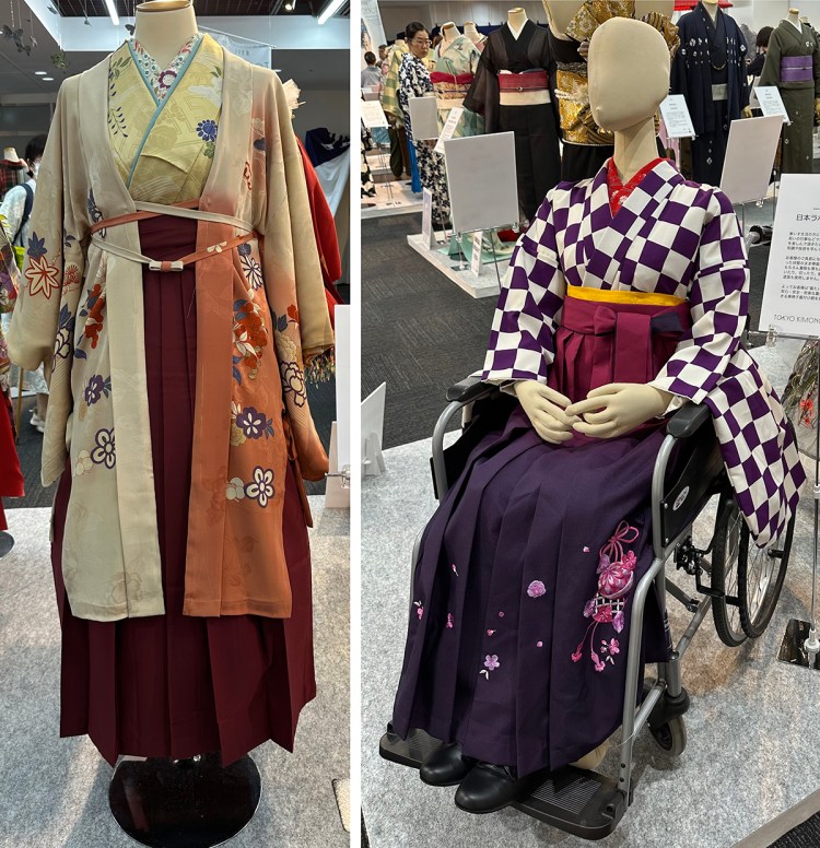 And I was pleased to see that graduation outfits (in which mens’ hakama trouser skirts are worn over furisode kimonos) got a little styling uplift with innovative cord work, and that graduates in wheelchairs weren’t left out of the fashion parade.