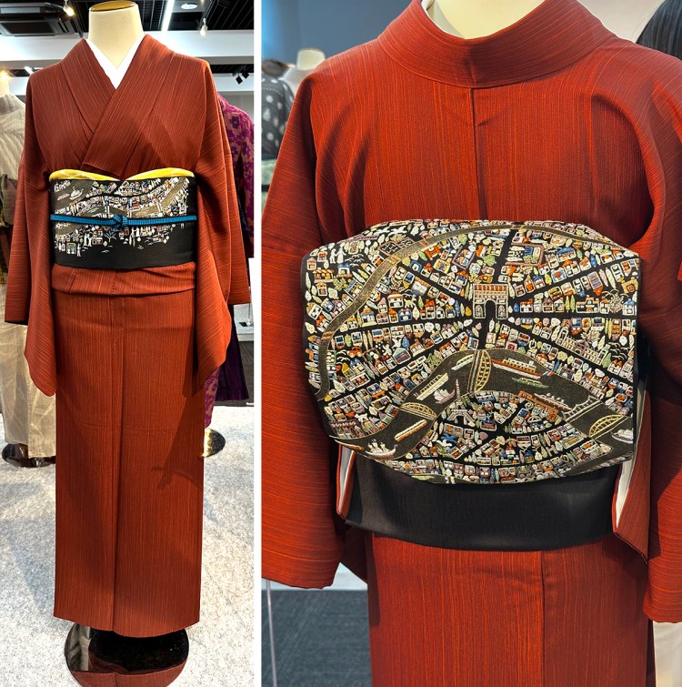 and this simple kitsuke with an aerial view of Paris meandering around the obi.