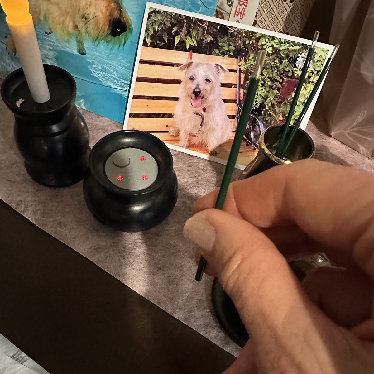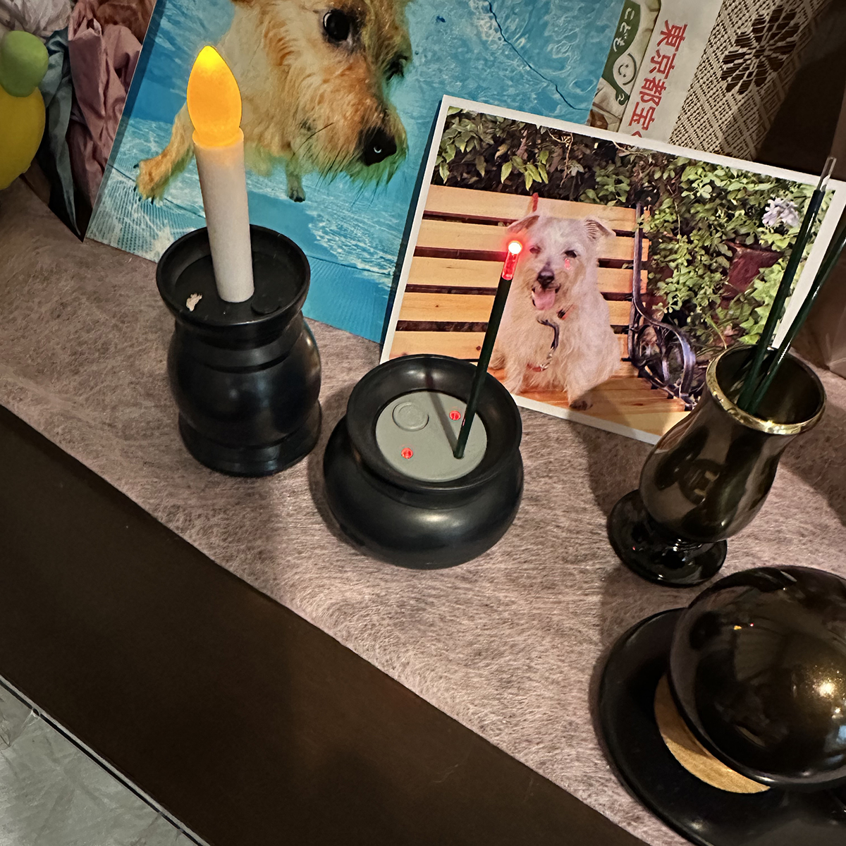 The fear of fire still runs strong in Japan, because within living memory, everyone still lived in houses built of wood and paper. Incense burning before the ancestral name tablets was often a culprit. Which is why you can now offer your prayers before an electronic urn fitted out with an orange LED and pay your respects with a light-conducting “stick of incense”!