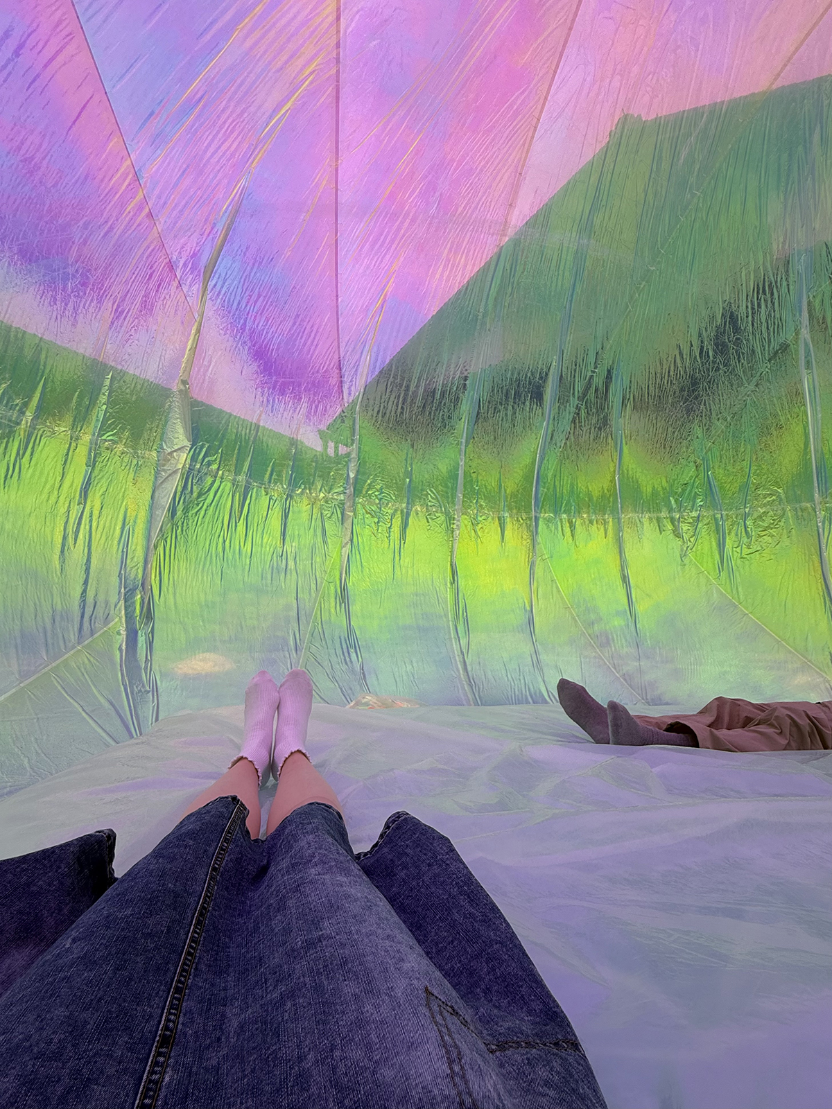 only becomes more surreal when you crawl inside and lie down on the wiggly waterbed to experience the historic architecture through a scrim of brightly colored plastic.