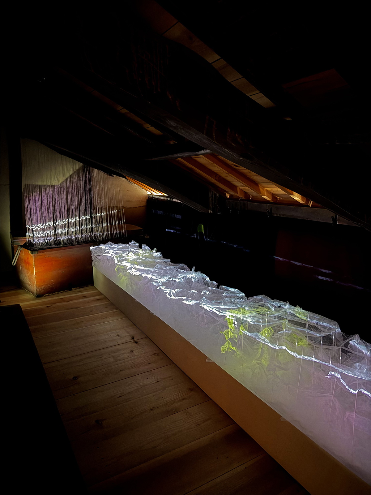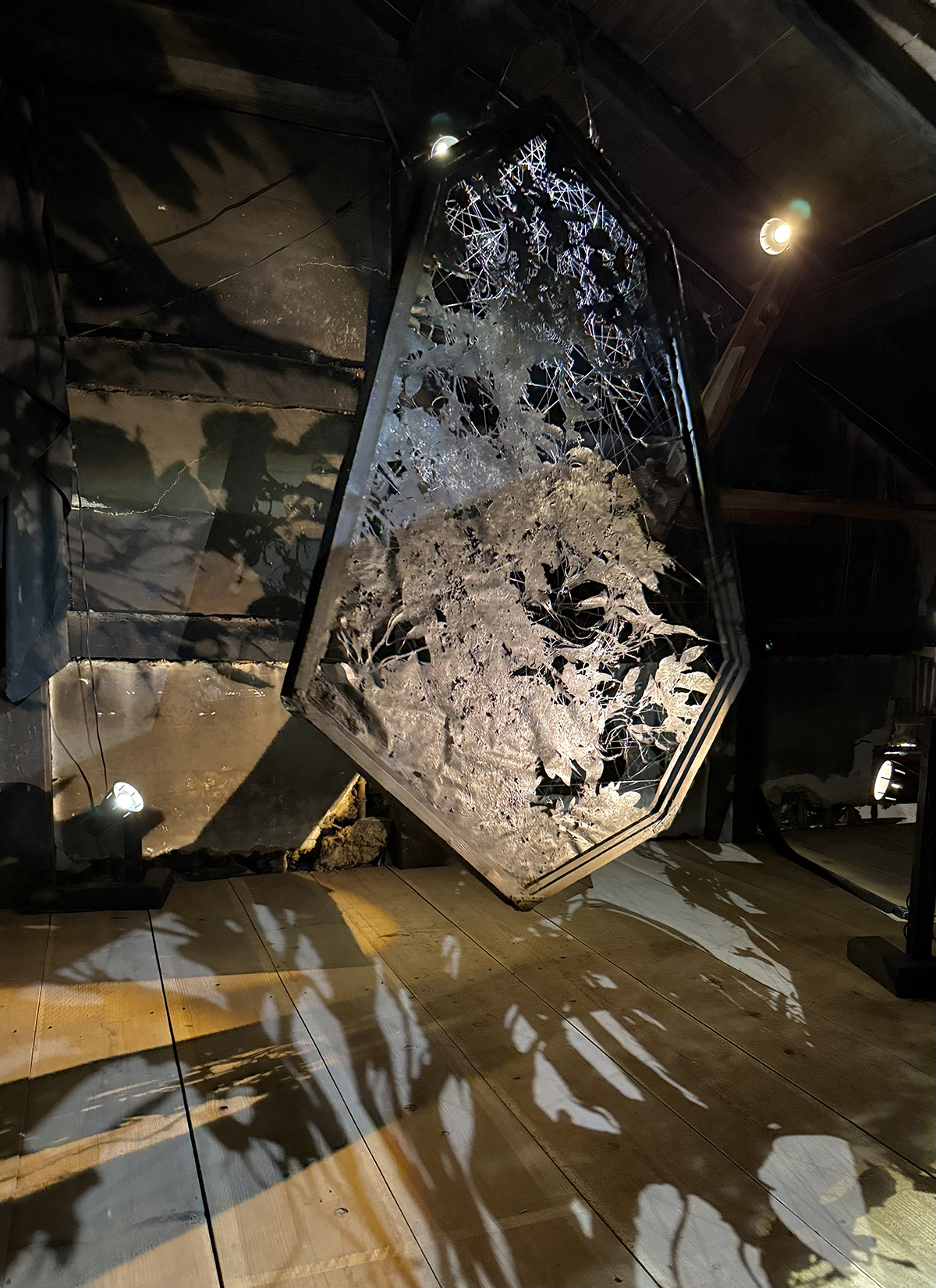 Many pieces seem designed for the spaces where they were exhibited, like this metallic sculpture inspired by native trees that spins in its attic space, casting swinging shadows of storm-tossed branches over the crazy angles of the walls (video on Instagram @jonellepatrick)…
