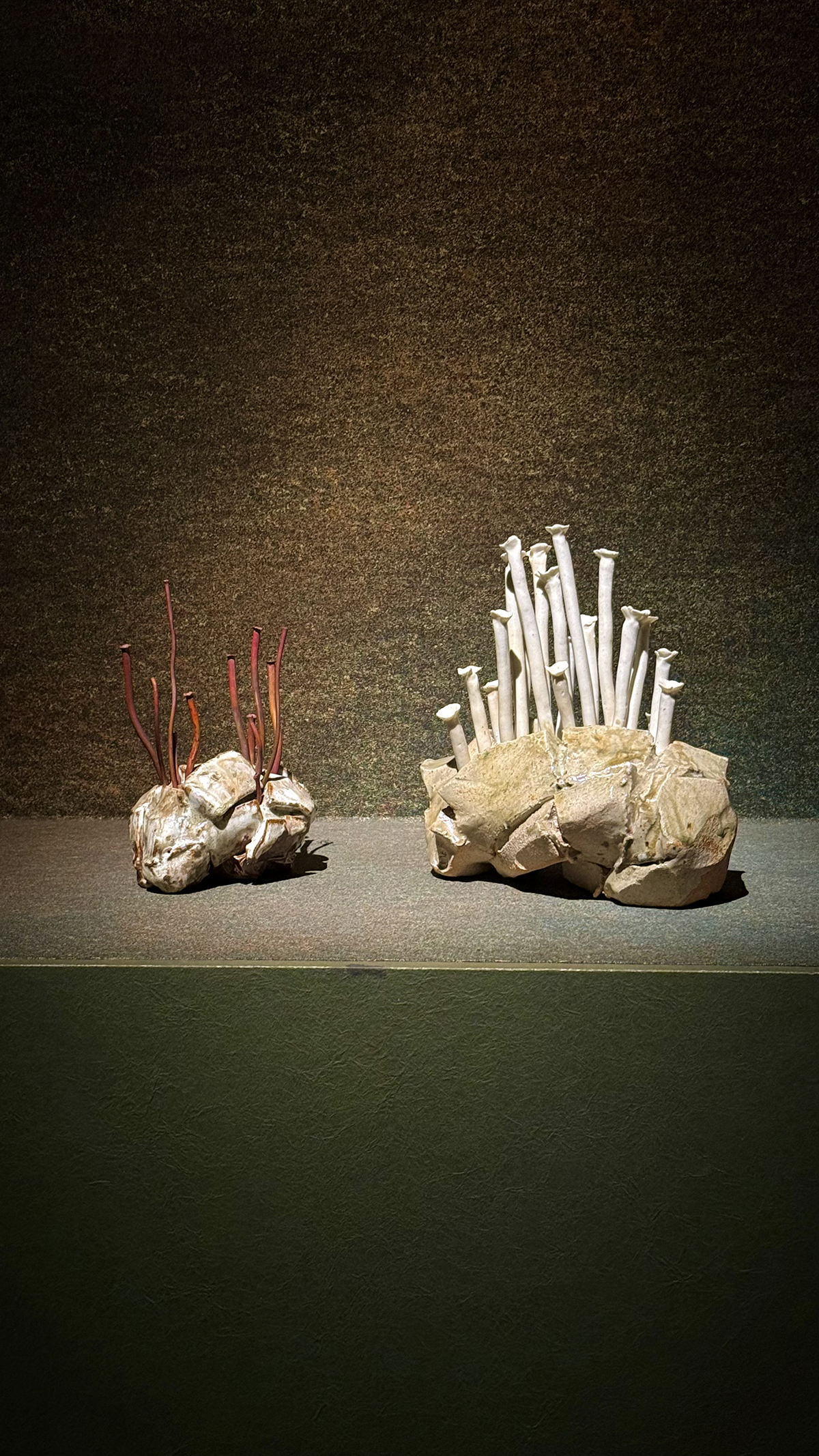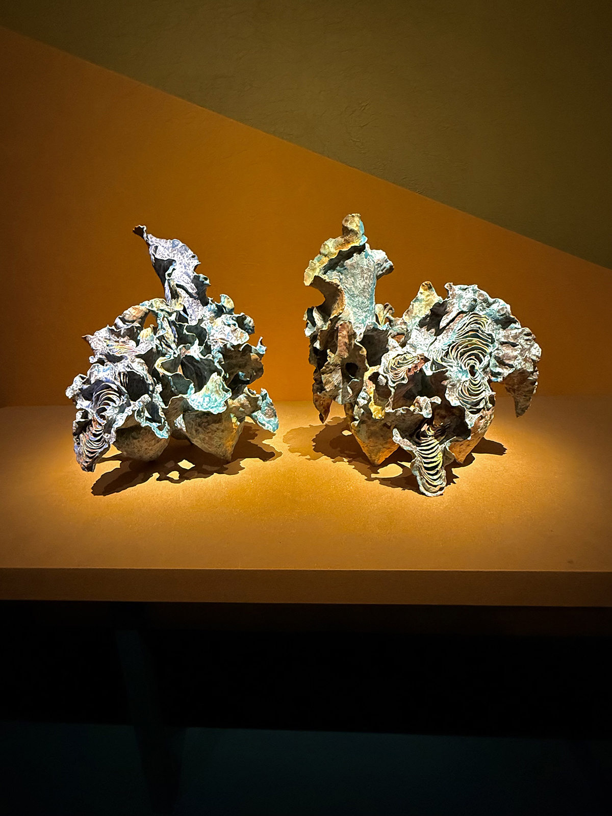 and the pieces are chosen to present a world-wide range of inspiration, from this artist’s commentary on change and permanence (as shown by the left-hand “spouts” being made of ever-changing copper and the right hand ones formed from fired clay)…