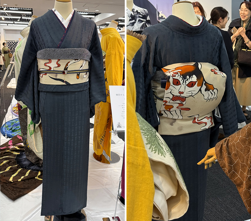 This year, it was the obis that were the real show-stoppers, like this one that looks perfectly appropriate for a ladies lunch from the front, with fun abstract designs…that turn out to be a monster cat in the back!