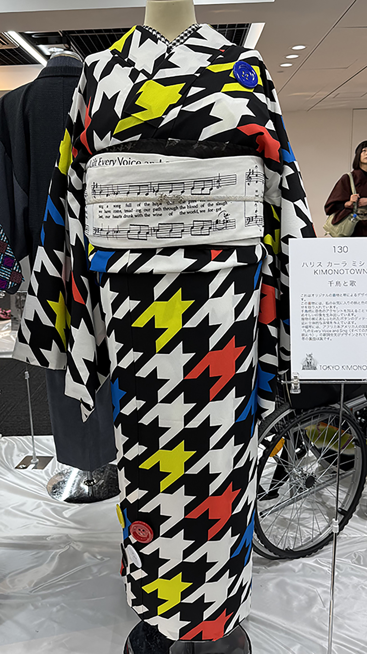 while this Mondrian-adjascent houndstooth number pairs with an obi printed with “Lift Every Voice and Sing,” the widely beloved national anthem of African Americans,