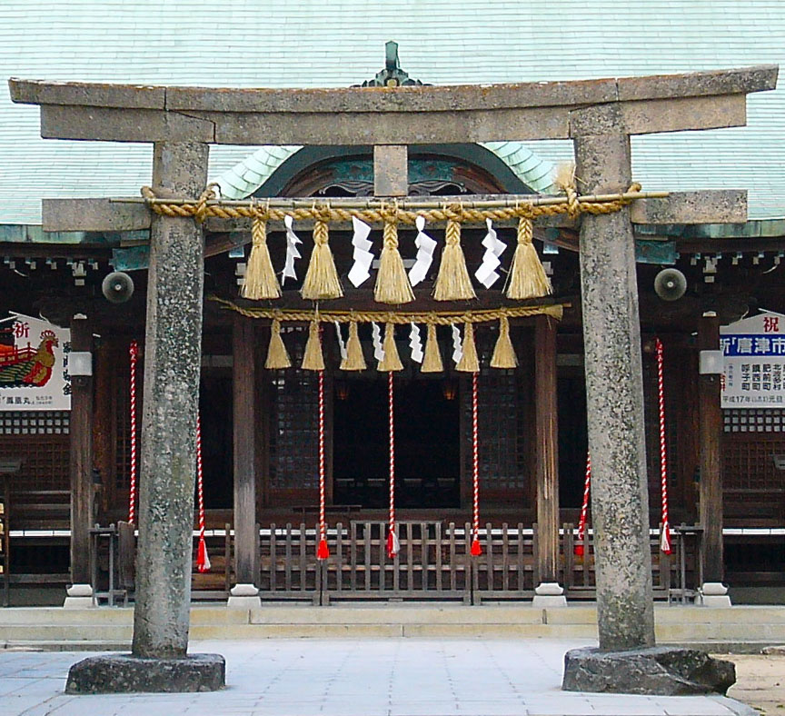 A shimenawa rope made from rice straw hangs on this torii gate to show that beyond the gate is sacred ground.