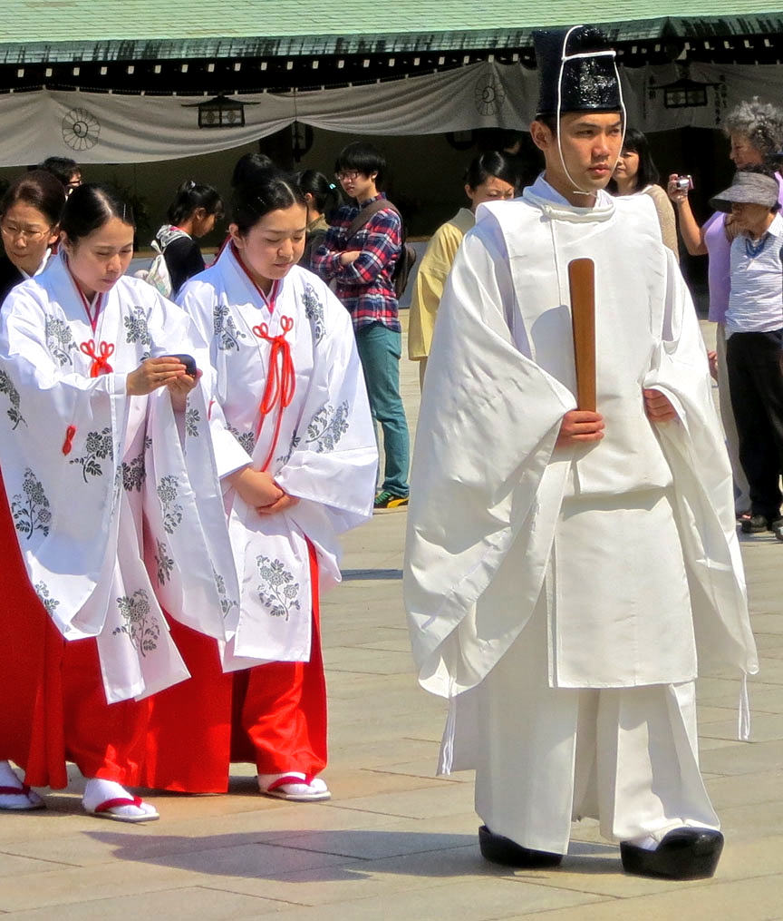 Previous Image Next Image 32.ShintoPriest Shinto priests wear white linen robes, lacquered black mesh hats, and black clogs.
