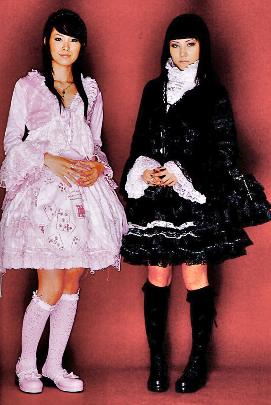 Side by side, a pink Lolita and a Gothic Lolita.