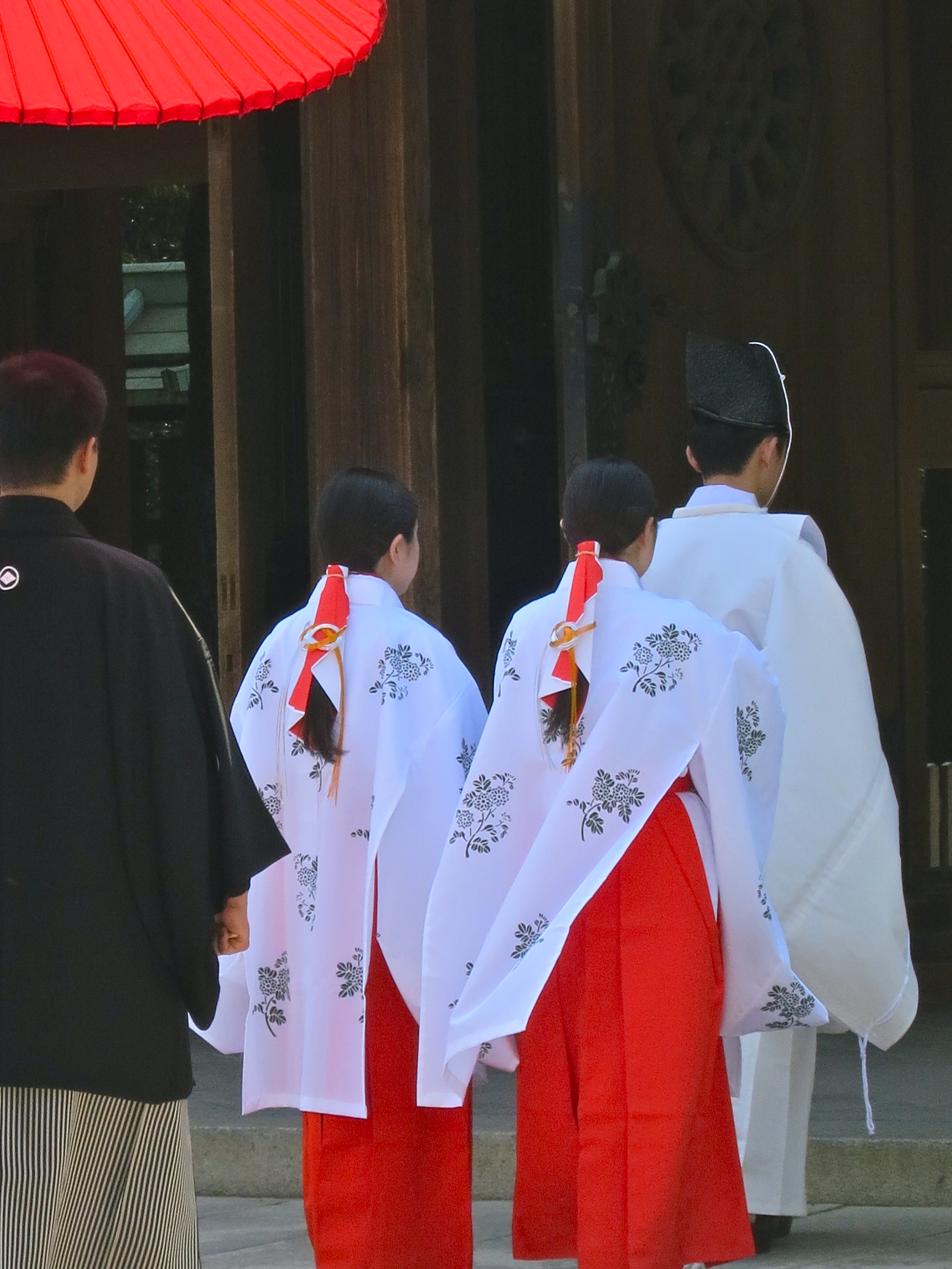Previous Image Next Image 8.ShrineMaidens Shrine maidens follow a priest into the shrine for a wedding ceremony.