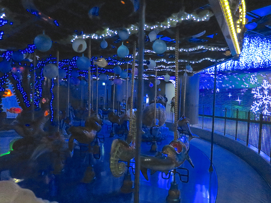 The carousel has been tarted up with blue and white lights.