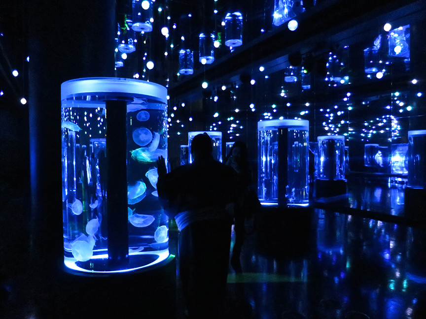 Taking a page from the fabulous Art Aquarium’s playbook, the jellyfish are displayed like jewels in and ever-changing snow and star themed light show of a room