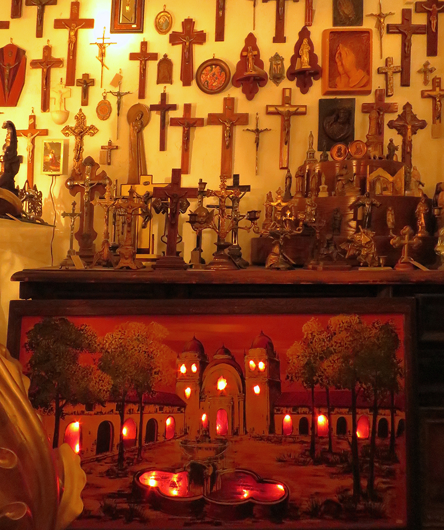 A fine selection of crucifixes for every decorating need, plus this one-of-a-kind light-up mission painting.
